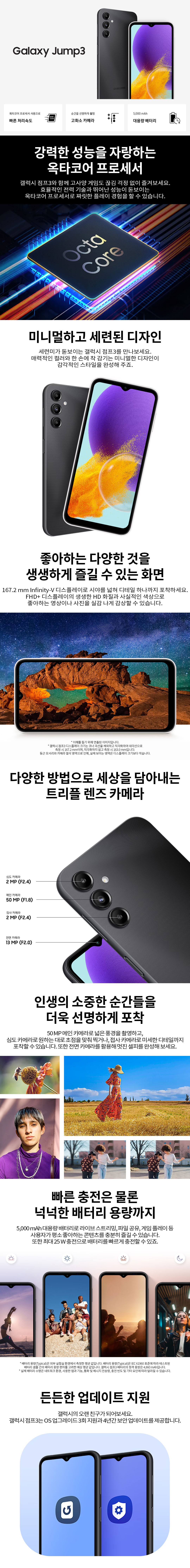 [단순개봉/풀박스패키지]★ 갤럭시 점프3 단순개봉 한정 수량 할인특가! 갤럭시 점프3는 6.6인치 FHD+ 디스플레이와 120Hz 주사율을 지원해 화면 스크롤과 영상 시청 시 더욱 부드러운 화면을 제공하여 SNS, 영상, 게임까지 일상 속 모든 콘텐츠를 더 넓고 선명한 화면으로 즐길 수 있습니다