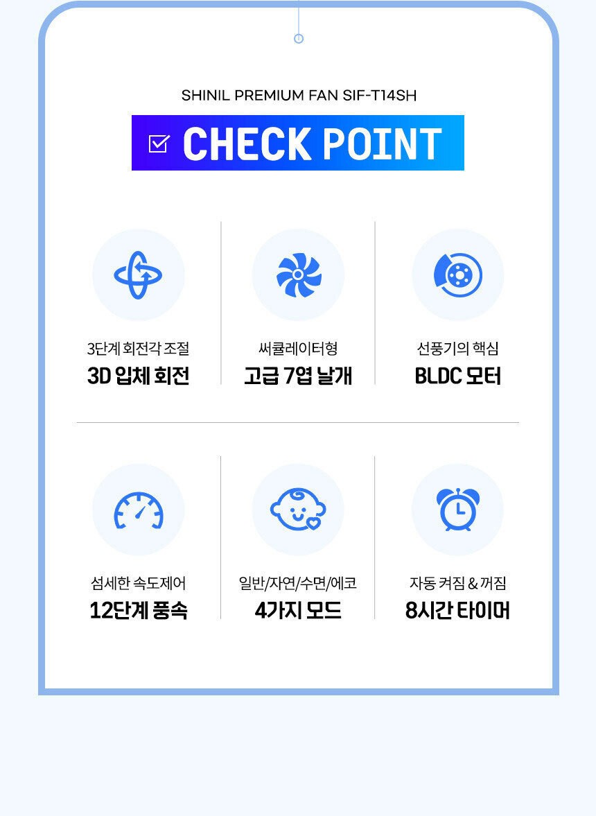 3D 입체 회전 / 고급 7엽 날개 / BLDC / 12단계 풍속 / 4가지 모드 / 8시간 타이머 / 리모컨 / 수면풍, 자연풍 / 8시간 타이머 / 제조사 AS 3개월