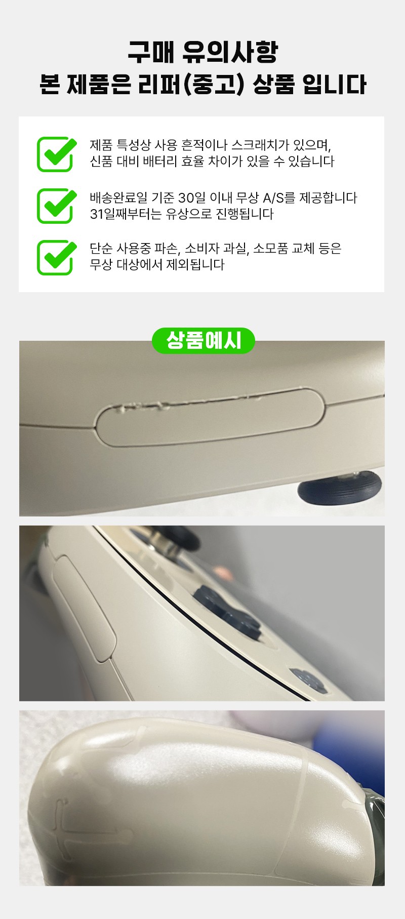 A급리퍼 제품의 경우 외관(바디)에 생활 스크래치가 있을 수 있으며, 이로 인한 교환 및 단순변심 반품은 불가합니다.