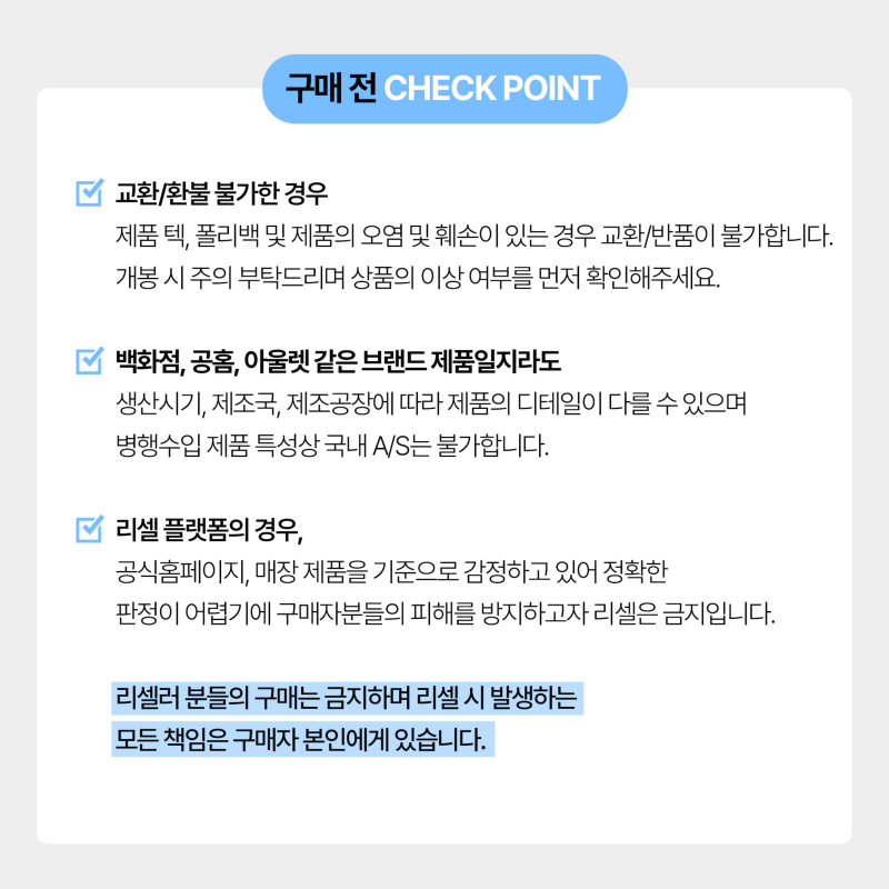 단순변심으로 인한 반품진행 요청시 본품박스가 없을 경우 반품진행이 불가하오니, 구매후에도 박스를 반드시 보관해주세요.