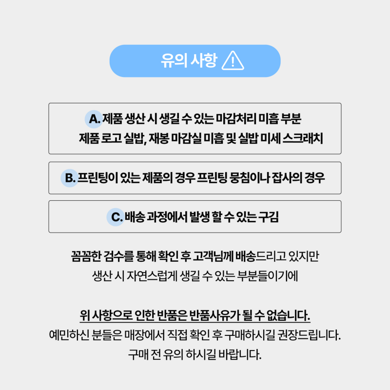 교환/반품시 고객님이 포장 후 택배이동중 파손 발생시 당사에서 책임져 드릴수 없는 점 사전 안내 드립니다.